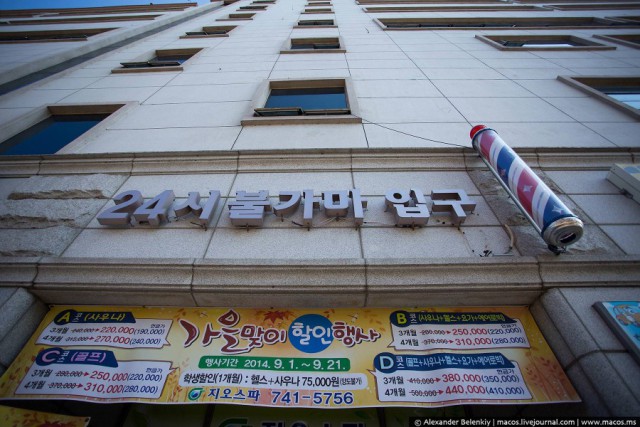 Если будете путешествовать по Корее, и захотите получить опыт такого ночлега, лучше подготовьтесь заранее, и найдите в нужном вам городе чимчильбан. На хангыле, корейском алфавите, это пишется как 찜질방. Или просто ищите знак парикмахерской (крутящийся тубус справа) рядом с цифрами “24”.