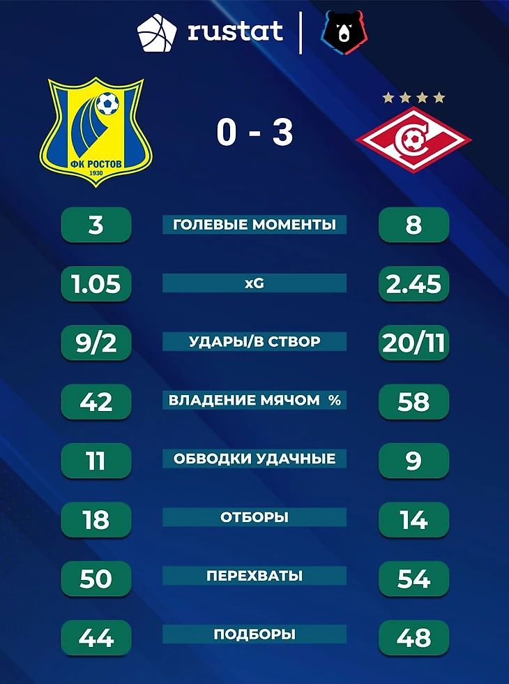 Портал Rustat предоставил статистику матча и мы видим более чем двукратное преимущество Спартака по таким показателям как: голевые моменты, ожидаемые голы (xG), удары.