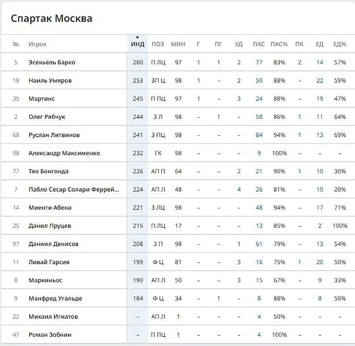 Тот же портал предоставил данные по игрокам. Самый высокий индекс у Барко (260), следом Умяров (253) и Мартинс (245). По точности передач высокие показатели у Умярова и Мартинса (88%), по выигранным единоборствам самый высокий показатель у Абены (71%)