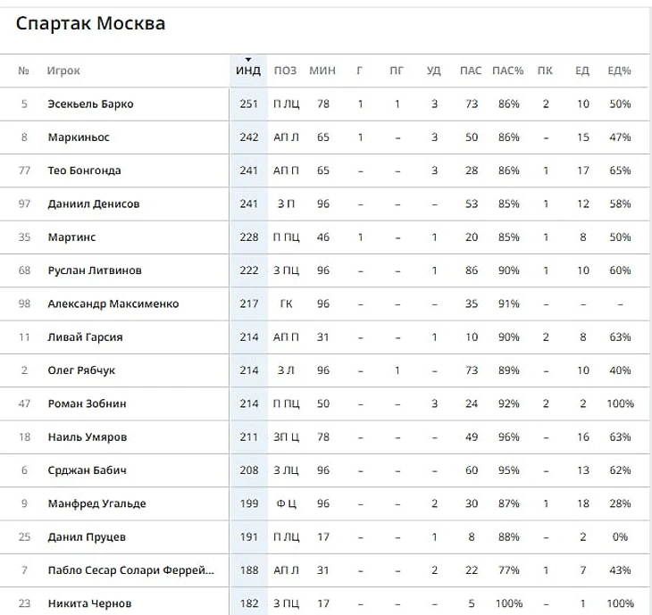 Тот же портал предоставил статистику игроков. Отмечу, что все игроки в плане точности передач показали высокий результат, лучшим же был Зобнин (92%), так же у Романа лучший показатель выигранных единоборств (100%).