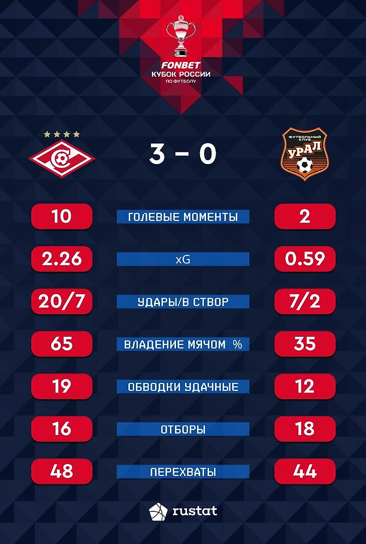 Портал Russtat предоставил статистику матча, и мы видим, что Спартак полностью переиграл соперника и счет вполне по игре.