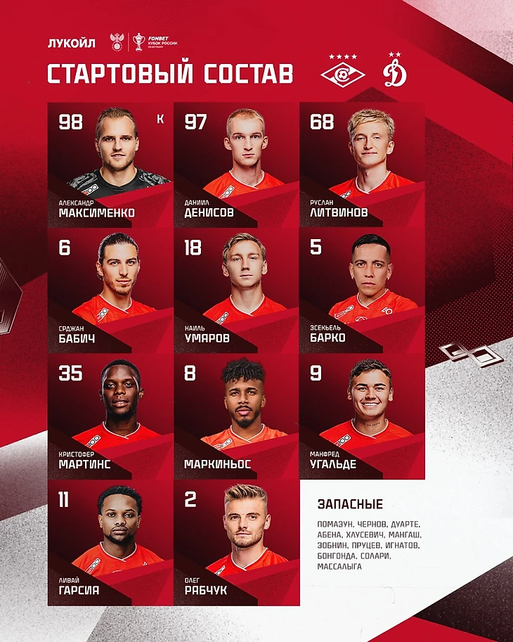 На 62 минуте Станкович сделал первую замену выпустив вместо Угальде - Бонгонда. На 78 минуте вместо Мартинса на поле вышел Пруцев, а за 5 минут до конца основного времени произошла двойная замена: вместо Денисова и Гарсии на поле вышли Зобнин и Солари.