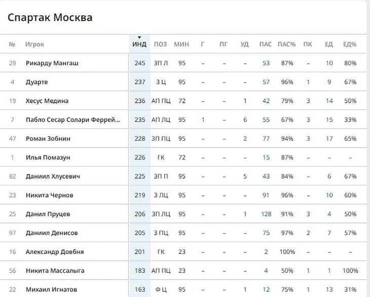 Самый высокий индекс у игроков у Мангаша (245), далее Дуарте (237) и Медина (236). По точности передач самый высокий показатель у Дуарте (96% это топ) по выигранным единоборствам хороший показатель у Мангаша (80%)