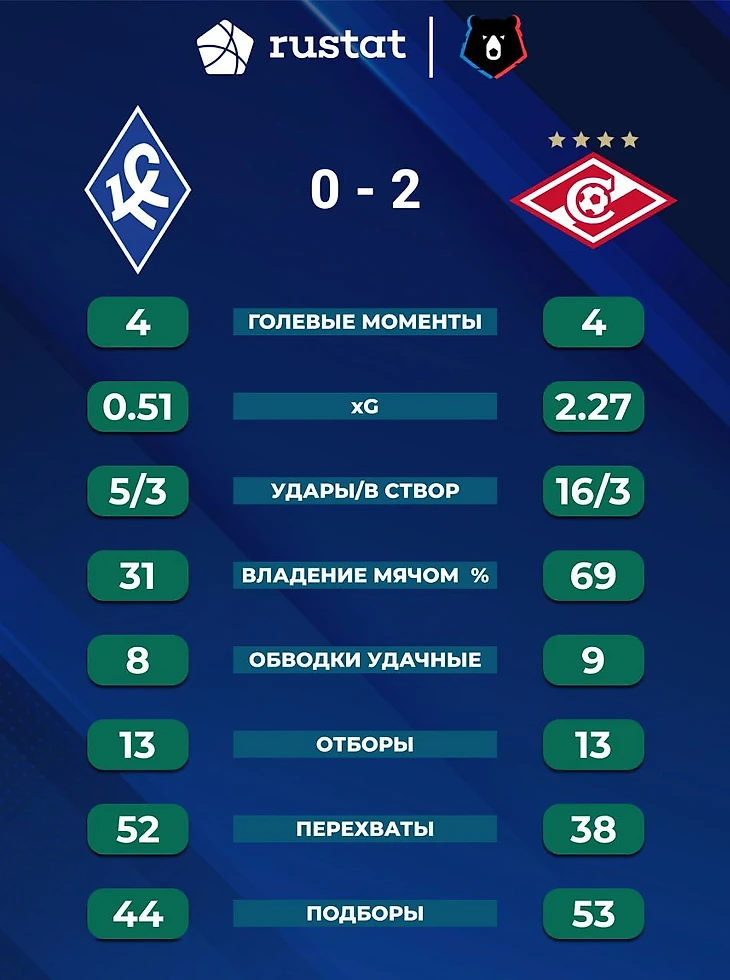 Портал Русстат предоставил статистику матча. Не знаю где было 4 голевых момента у хозяев, в лучшем случае один. По ожидаемым голам явное преимущество у Спартака, как и по общему количеству ударов.