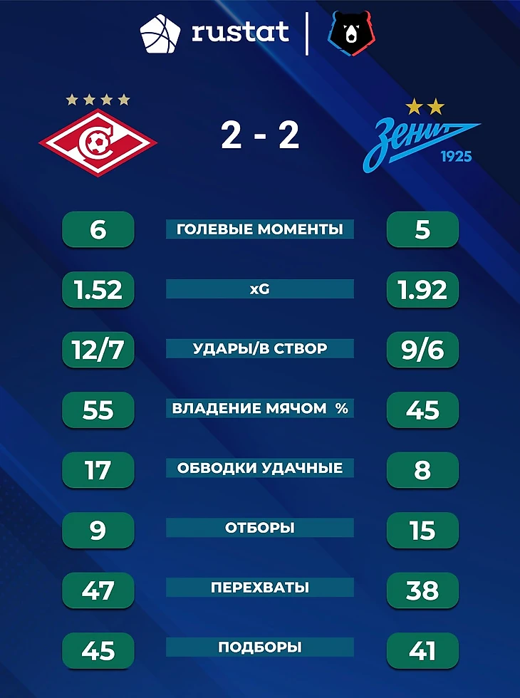 Портал Русстат предоставил статистику игры. Как видим в атакующих показателях команды примерно равны, а и в целом показатели примерно равные, что говорит о справедливости результата.