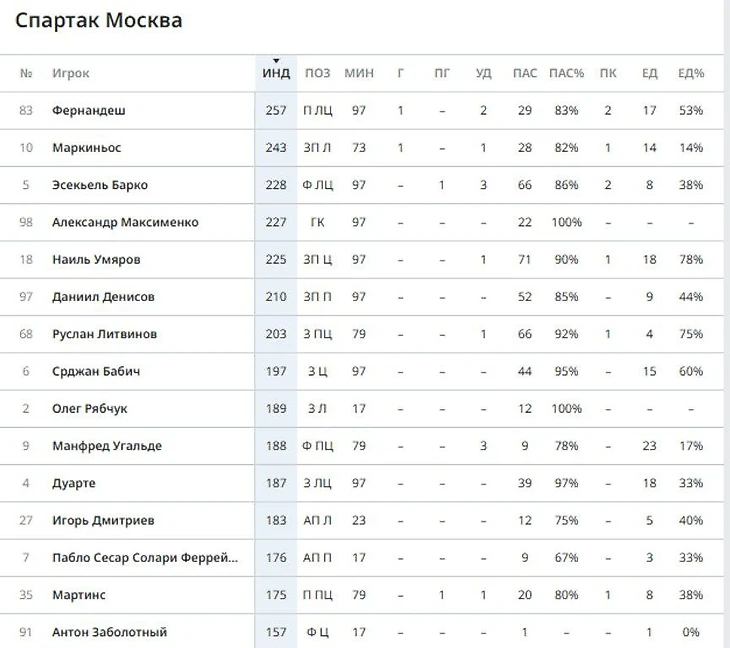 Тот же портал предоставил данные по игрокам. Самый высокий рейтинг у автора второго гола Жедсона (257), далее автор первого гола Маркиньос (243) и Барко (228). По точности передач лучший Рябчук (100% это топ), на три процента отстал Дуарте (но все равно показатель топовый) и на 5 процентов - Бабич. По выигранным единоборствам лучшие Умяров (78%) и Литвинов (75%), что удивительно оба игрока не самой сильной комплекции и единоборства явно не их конек.