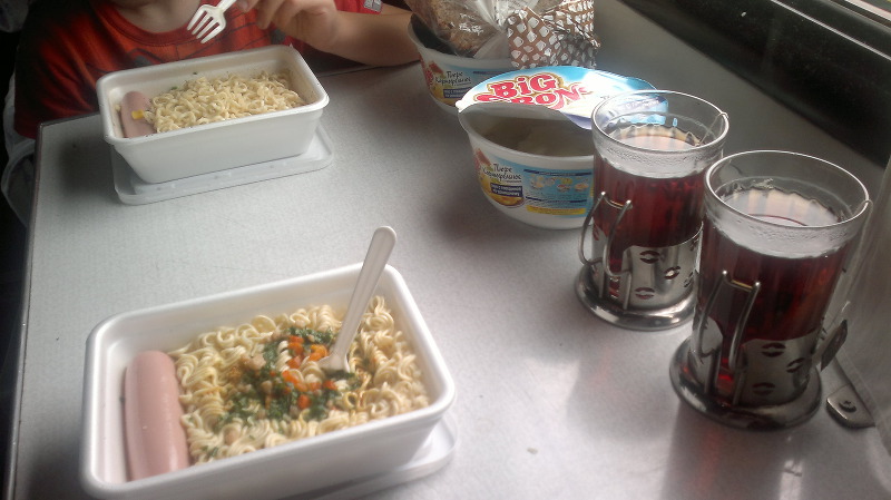 Загрузившись в вагон и постелившись мы сразу легли спать – время было уже далеко не детское – 23:50, а мяса в вагоне практически совсем не было – очевидно все уже давно кисли в Самаре. Проснувшись утром и позавтракав привычным поездным меню: