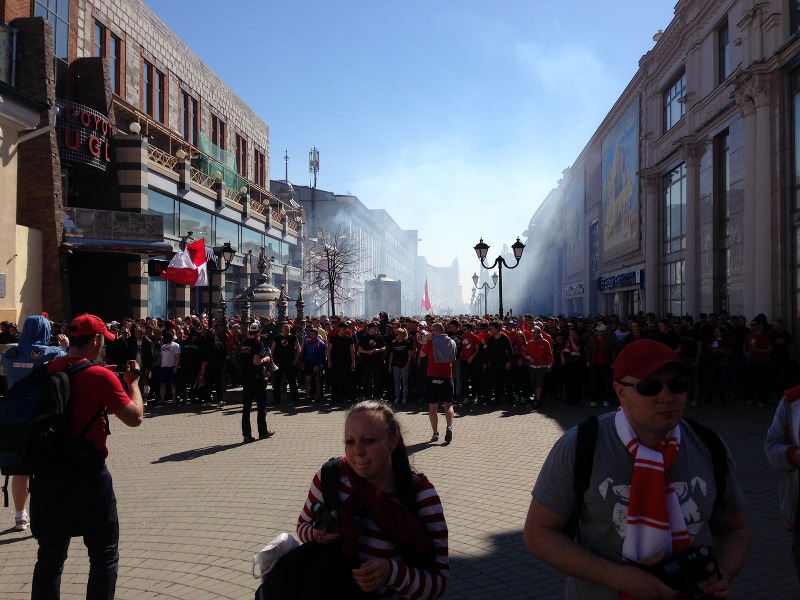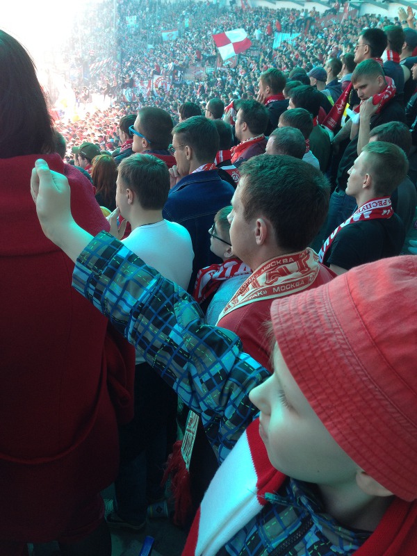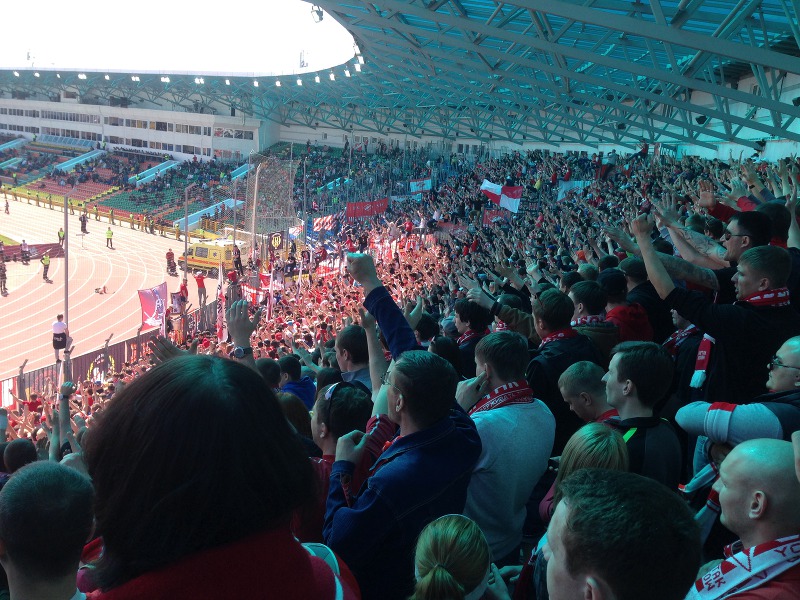 Красно-белого фанатья приехало очень много, что не может не радовать. Выходной день и прекрасная погода сделали свое дело – несмотря на отвратную игру нашей команды в последнее время, а также на дороговизну билетов (аж целых 500 рублей) обещанные 7 000 щщей радовало глаз красно-белыми цветами