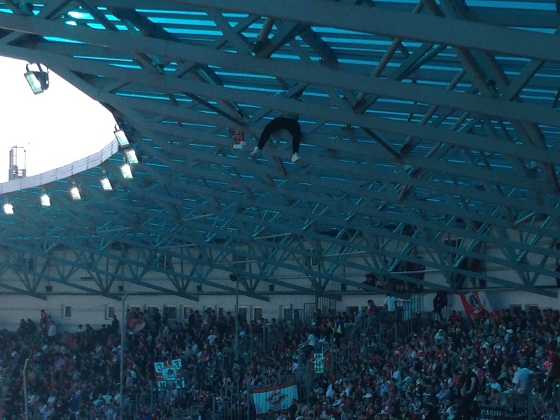 Во втором тайме на нашей трибуне появился человек-паук, который по балке на крыше добрался почти до самого края и зачем-то оставил там розу