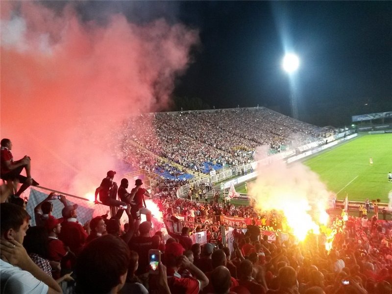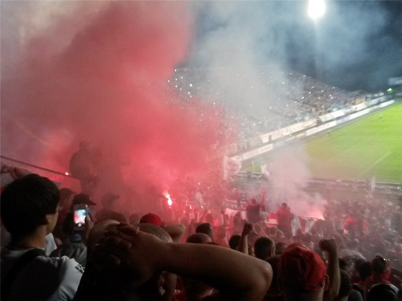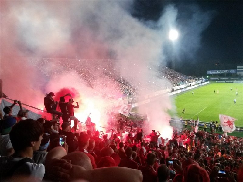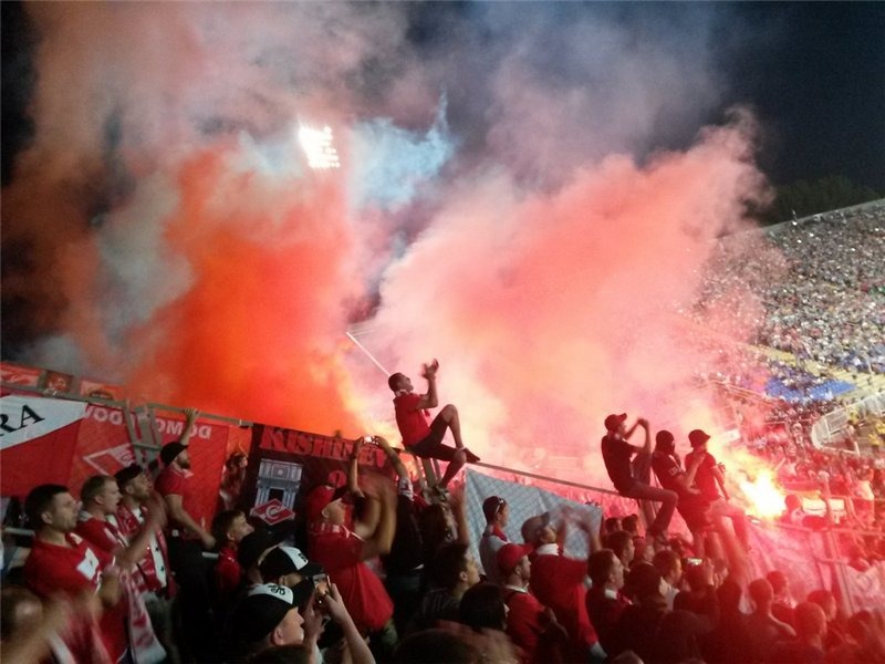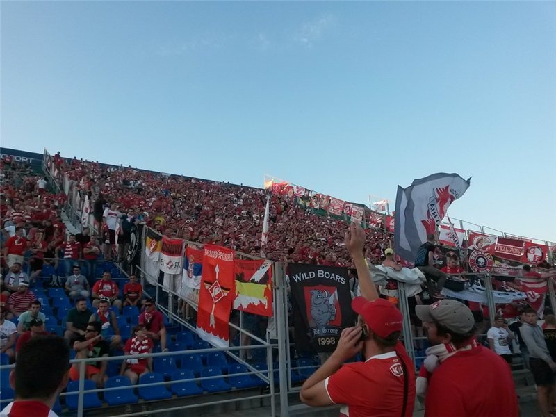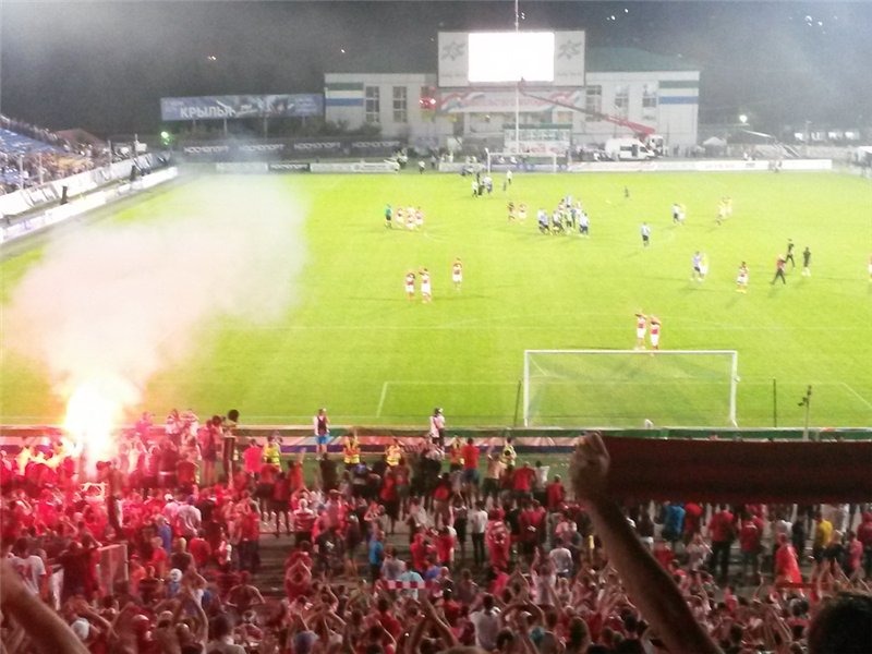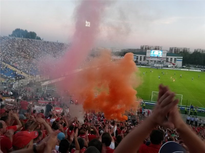 Матч был вечером, до него мы коротали время на пляже, погода в этот день была супер, мне лично показалось около 30ти градусов. Правда я почему-то решил не загорать и не купать в этот день. Перед матчем мы зашли в хостел, сбросили все не нужное и в 18:00 вывали 2 такси (матч был в 20:00), первое такси пришло минут через 40, второе где-то 50, может час, причем мы вызывали в итоге около 7ми машин, а доехали только две!!! В другие дни с подачей такси проблем не было, видимо сказался день матча. Доехали относительно быстро, но все равно время поджимало, т.к. оставалось 30 минут, а мы планировали приехать за час. Очередь перед входом тоже оставляло желать лучшего, но как ни странно еще минут за 7-8 до матча мы уже была на секторе. Досмотра как такого не было, можно было проносить все что угодно. Как было сказано, первые 20 минут почти весь стадион был в полной тишине, только Промес заставил нас заорать на 5й минуте, забив гол. Игра была не идеальной, но было видно что КС сегодня ничего не светит, и мы выиграли 2:0, как мне показалось не напрягаясь. Шиза была несколько раз неплохой, но в основной сектора друг друга не слышали, как сказал даже заводящий: "Одни торопяться, другие слишком медленно поют". Пиротехника была в поряде, хотя я видел и больше, а при таком шмоне, ее можно было занести мешками. В конце игры команда подошла нас поблагодарить, и видно все ждали что как в Краснодаре игроки будут кидать нам футболки, но этого игроки делать явно не хотели, тогда парочку фанатов прорвались на поле и попросили футболки. Порадовал момент, Зе Луиш к моменту прорыва на поле, уже уходил в раздевалку, его начал догонять один из болел, он увидел и испугавшись снял футболку и отдал. Самарские менты и в этот момент никуда не стали влезать. Они вели себя лояльно как в городе, так и на стадионе. На стадик пускали людей в любом состоянии опьянения, может это и повлияло в итоге на шизу. Держать нас не стали, как это бывает час, а сразу выпустили, что для всех было приятным шоком. Единственный минус Самары, это стадион. Он расположен в такой жопе, что оттуда после мячика не уехать: в маршрутку не сесть, такси ждать долго. Уехали мы где-то через часа полтора после матча, поймав дикого водителя на старой жигули. Это был прикол конечно, машина полуразваливалась, ехала 30 км в час не больше, вся кряхтела и скрипела. В итоге проехав километра 2-3 он на высадил, и поймал нам нормальную машину. Дальше мы есть, а я спать, т.к. утром самолет.