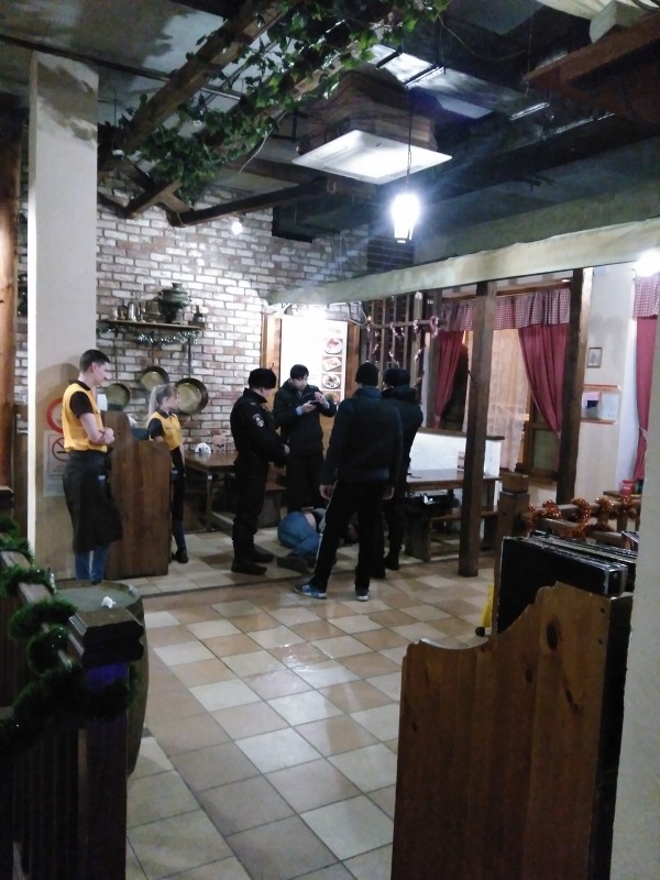 Собрав шмотки правоохранители его увели. Мы думали всё, но не тут, то было, минут через 10 влетает это придурок и бежит за стол, где они сидели. Его увели из заведения, мы сразу вышли покурить, и спросили у ментов, почему они его не отвезли на машине? Ответ был, что боятся за салон своей машины, мол, заблюёт. В общем, вечер был интересный.