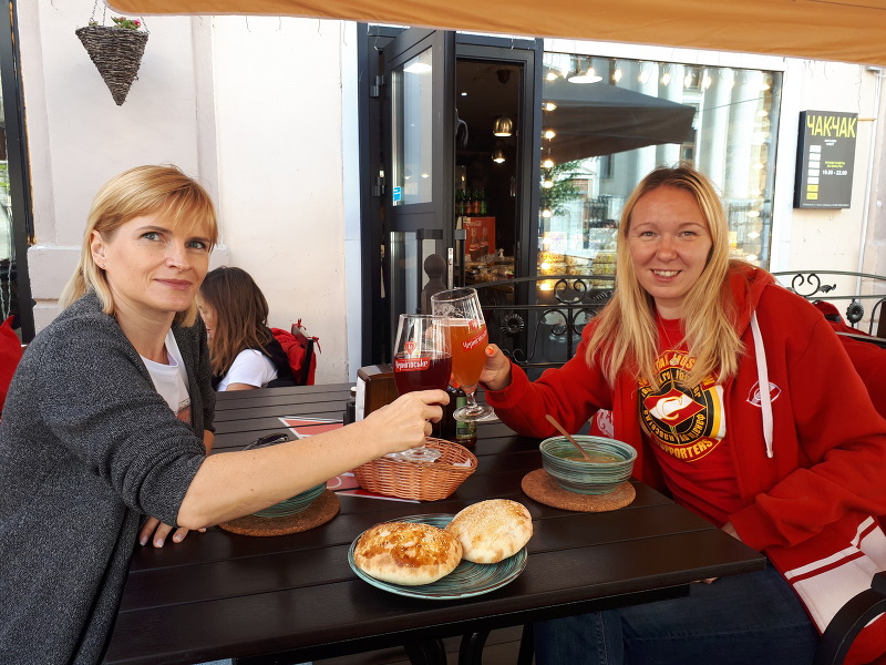 В поисках нормального заведения, в котором можно было посидеть и пообедать, мы прошли всю центральную улицу, наших везде было большое количество и обслуживание сильно хромало. Наконец, нашли приятное заведение в красно-белых цветах, выпили вкуснейшего крафтового пива с оригинальными названиями, съели по супчику и пару тарелок с закусками.