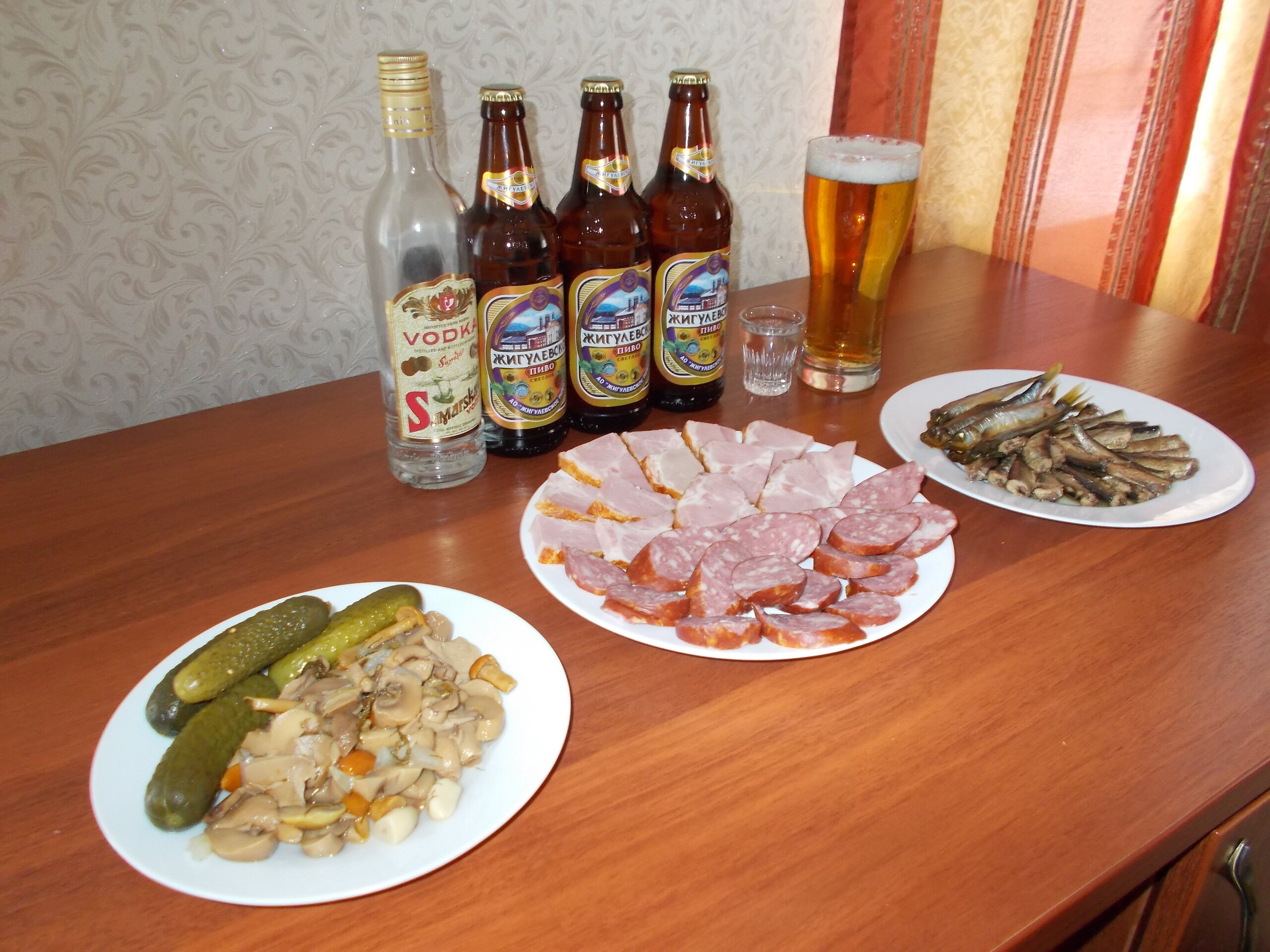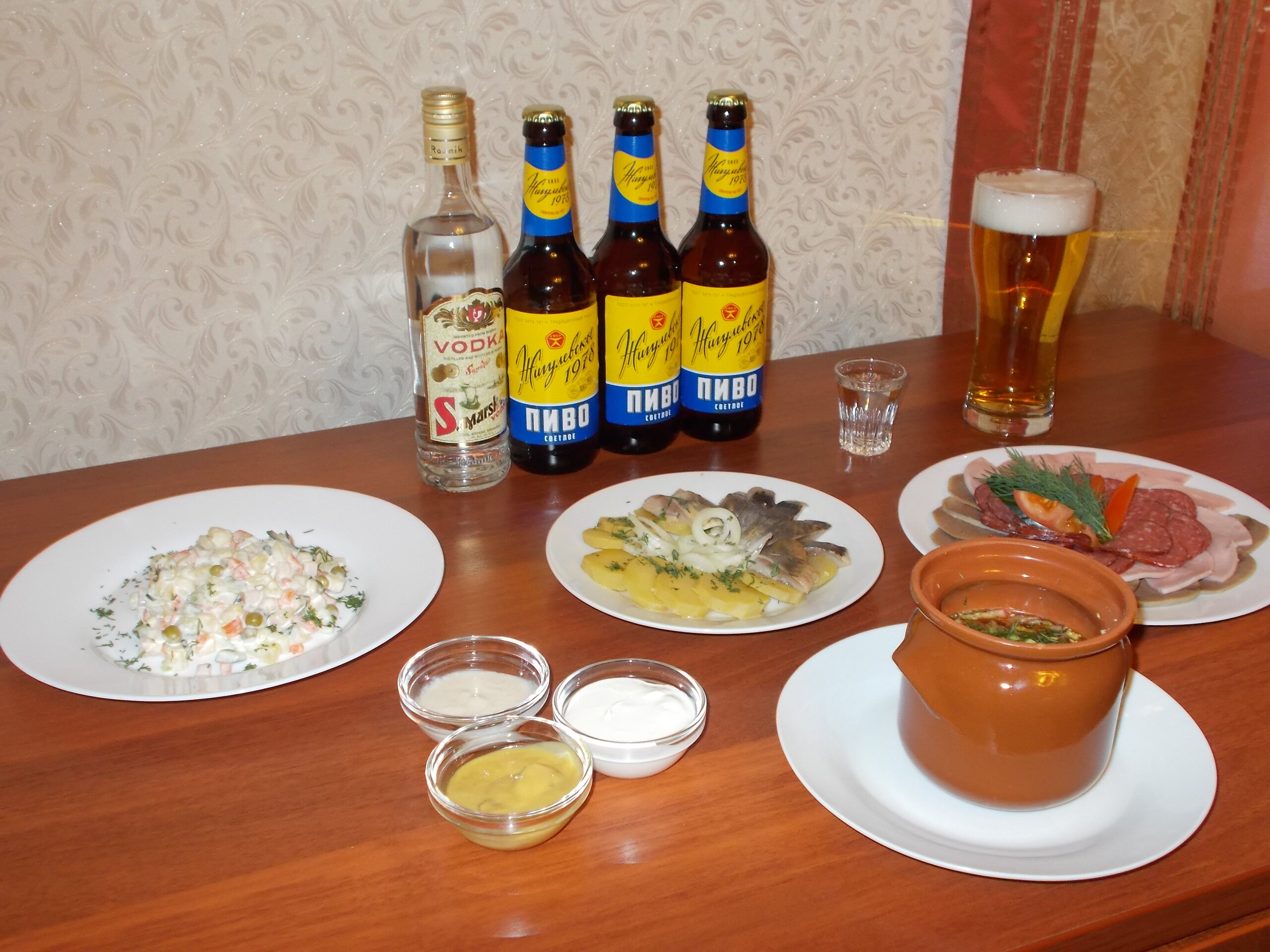 К трапезе по случаю моего приезда в Самару гостиничное кафе приготовило салат "Оливье", окрошку, селедочку с лучком и картошкой и ассорти из мясных закусок.
