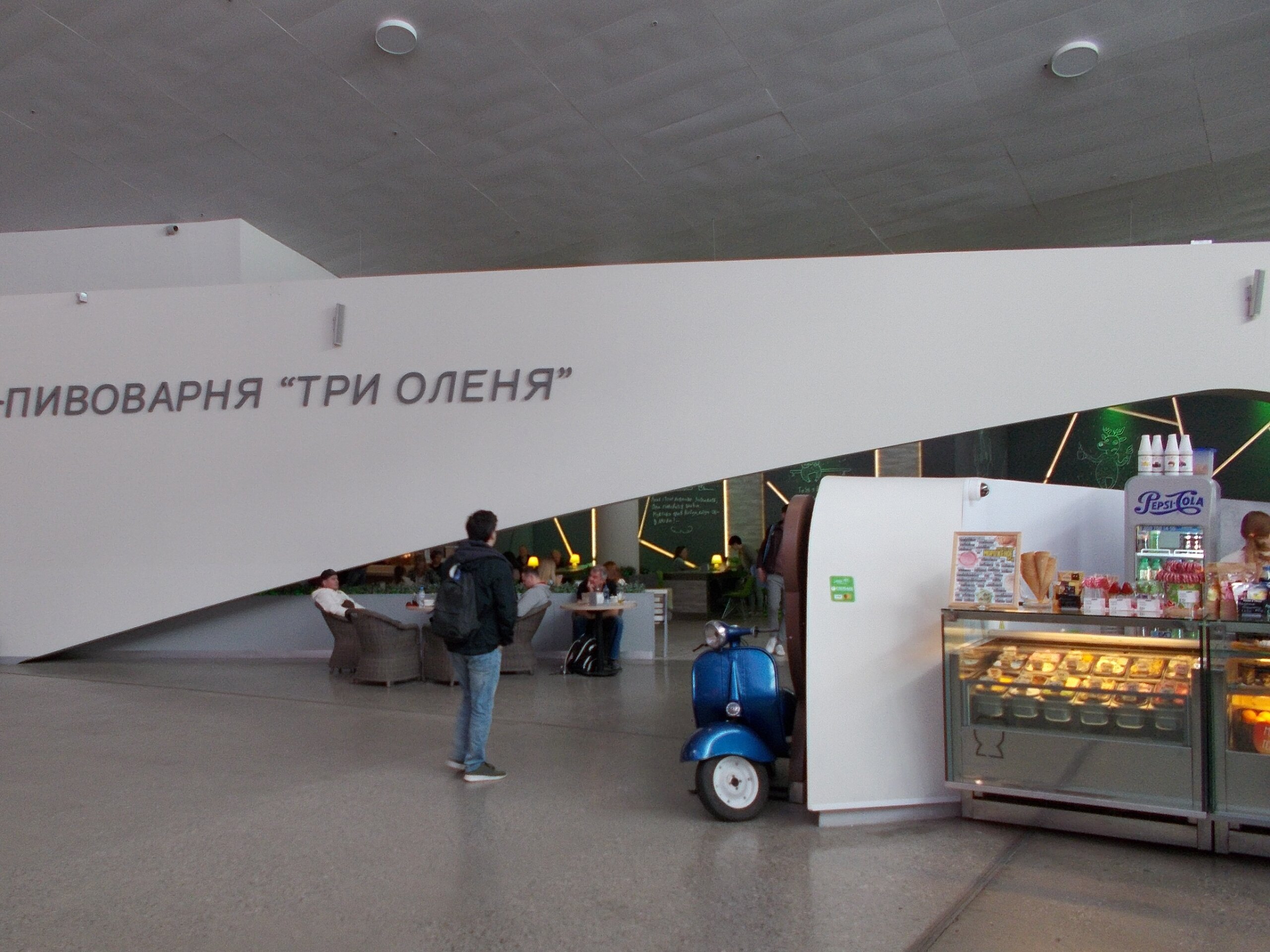Мотороллер, припаркованный рядом с рестораном "Три оленя", похоже, используется для доставки пива пассажирам.