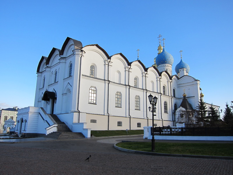 Авторы русские зодчие Постник Яковлев и Иван Ширяев. Те самые, что возвели собор Василия Блаженного на Красной площади. Вопреки легенде их не ослепили, а направили на строительство Свияжска и Казани. В Соборе Успения Богородицы сохранились фрески времен Ивана Грозного, но к сожалению осмотреть их возможность не представилась – храм в это время года был закрыт, о чём свидетельствовала табличка на входе.