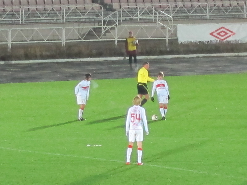 Фанатов Рубина практически не было видно, не говоря уже о слышно. Желание поддержать Спартак присутствовало у многих, но о слаженности говорить не приходится. Одни куплет начинают, другие уже окончили. Петь это конечно хорошо, но ещё и необходимо слушать других. После перерыва значительная часть на трибуны не вернулась. Во втором тайме переместился ближе к центру. Там в верхнем углу нашего сектора шла тема про кепку. Кто носил этот головной убор я не понял, но досталось ему по полной программе – сатирическое творчество достигло своего апогея, и подколки были одна кучерявей другой. Наша молодежка владела преимуществом, но перевести его в голы так и не смогла.