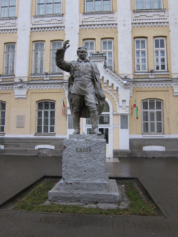 Возле кремля стоит памятник Мусе Джалилю на фоне Спасской башни.