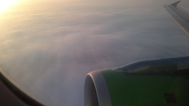 Как потом оказалось не зря, так как пришла инфа, что большинство народа приняли акабы прямо в городе. Помочь мы им вряд ли чем смогли бы и лично для меня началась вторая волна нервотрепки – подмосковные, а затем и московские пробки. Как не пытался я вычислить примерно время прибытия, оно все откладывалось и откладывалось, а шансы мои успеть таяли на глазах. Страшнейшая, по закону подлости пробка на МКАДе окончательно меня убедила в том, что я опоздал и вот, я уже звоню жене, чтобы передать ей грустную новость. Но тут в голову приходит последний вариант, который я тут же проговариваю с водителями. Хер с ним с метро, тупо выбросите меня на пересечении с каширкой, а там, может быть, что-нибудь да поймаю. И вот я уже с нетерпением стою в ожидании Каширского шоссе, а пробка зараза, кажется становится только больше. В итоге за один час и 20 минут до вылета!!! Я выскакиваю под пожелания удачи от всех, кто остался из баса и с кольцевой, по нечищенным ступенькам буквально взлетаю на мост. Вот оно Каширское шоссе, в 25-ти киллометрах дармоедово. Осталось только поймать хоть что-нибудь. Все мои попытки на протяжении где-то 3-4 минут остаются безрезультатными. Только потом я соображаю, что дико туплю и на мосту мне все равно никто не остановится)))) Перебегаю его и начинаю всё заново и о чудо, останавливается машина. И за 500 рублей парень берется меня добросить в срок. Ну а что было дальше: море радости от того, что успел, чудом попадая на свой рейс, мокрый, голодный, уставший, но весьма довольный собой я с большой любовью делаю вот этот снимок из самолета