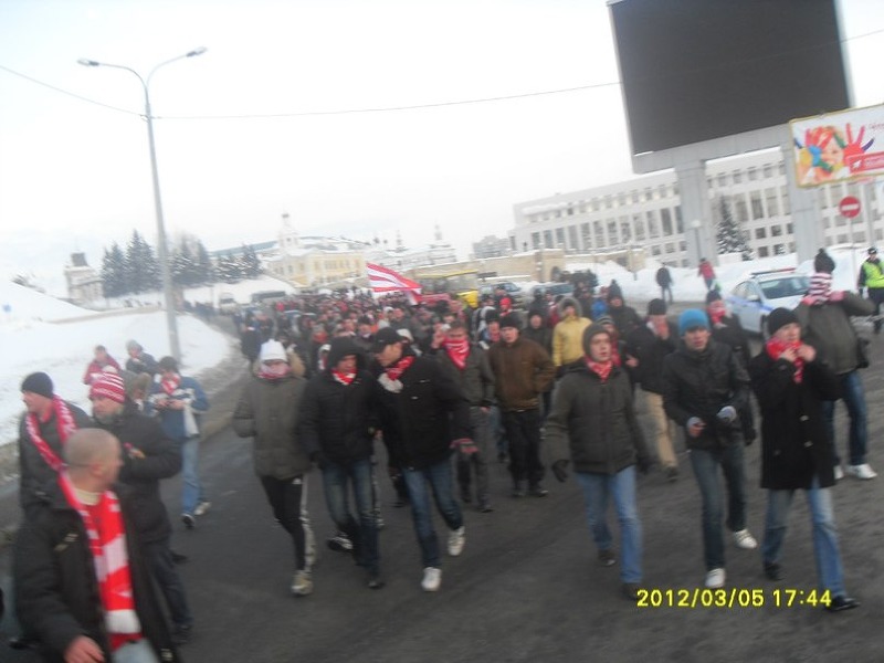 В Татарстане в начале марта валил снег, и вместе с ним выпал неожиданно выезд в Казань благодаря С. А. Фурсенко и С. Г. Прядкин. У первого уже давно был поставлен диагноз “Наследственное слабоумие” всеми людьми причастными к футболу напрямую. Если же обычно это заболевание передаётся по женской линии и поддаётся лечению, то в случае с сыновьями известного историка, академика РАН, переход происходит от брата к брату и обратно, причём многократно. И, к тому же, зимнее/весеннее/летнее/осеннее обострение выпадает на момент принятия решений. У второго, у Прядкина, личная неприязнь к бывшему другу Бердыеву забросила первый официальный матч 2012 года на полигон стадиона “Центральный”. Не подпортить настроение спартаковцам Сергей Геннадьевич совместно с органами власти (хотя какие это именно органы вызывает у меня подозрение) просто не мог. Поэтому перенос состоялся на понедельник, а не на субботу. Наверное, они, представители высших органов власти в российском футболе, могут сказать огромное СПАСИБО предстоящему переизбранию старого президента на роль нового царя. Но даже это препятствие не помешало болельщикам красно - белых прибыть на берега Волги ради поддержки любимой команды.