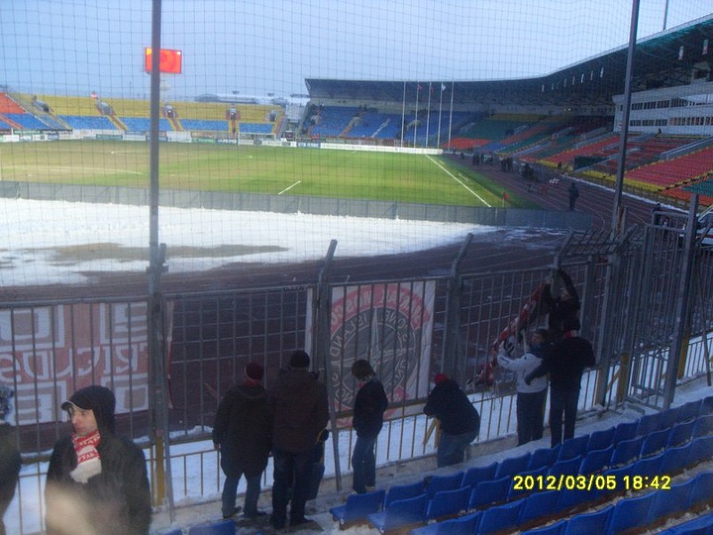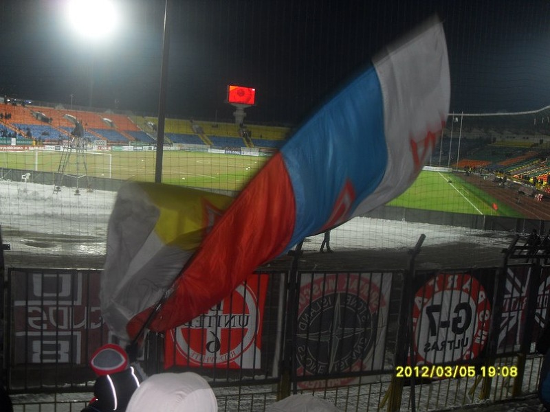 Полученный заряд гнал нас вперёд по заснеженным тротуарам столицы Татарстана прямо к стадиону через кордоны полиции, которая была на редкость адекватна, хоть в их действиях не наблюдалось логики всё равно. Например, чисто спартаковский флаг, без всяких надписей, всего лишь с ромбом и полоской по диагонали они заставили фотографировать, оставить данные хозяина. Но, зато, пропустили без всяких проблем “имперку”. Ну ладно, пустяки, нас уже было не остановить. Сказывается на поведении местных копов и то, что самые активные приходят на сектор раньше остальных, поэтому досмотр можно проводить тщательней, при этом без какого-либо давлении времени. В числе опасных оказались и мы. Идиотские вопросы “Где твоя шапка?”, “Почему ты сюда приехал?” и ещё один, который становится популярнее с каждым годом, “Пил ты до матча или нет?”. Теперь ещё и на татарском языке. Универсиада 2013 рядом, надо же с чего начинать становится полиглотом, хотя уже пора заканчивать во всём.