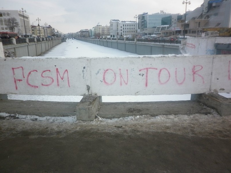 3, 2, 1 и …. Вот она, долгожданная встреча! С кем-то, а именно с Машей и Егором, увиделись впервые, с boje и Михаилом во второй раз. Нашей радости не было предела. Именно благодаря этому чувству Egorych1922, воспользовавшись рядом находящейся камерой (та самая, на которую снимали типа бардак, устроенный красно-белыми в поезде), решил повторить фразу уже известного на весь рунет поклонника цска и зарядил “Ебать зенит! Ебать!”. Никто, к сожалению, не услышал. Второй выстрел был на счету Макса, только звучал он куда отчётливей не только для местного телевидения, но и жандармов. Само собой, реакция с их стороны была отрицательной, за что один из них схватил за шею Макса и назвал “уёбой”. Ебать зенит – не преступление!