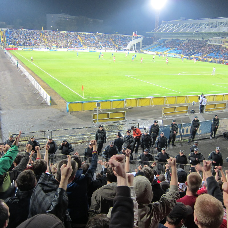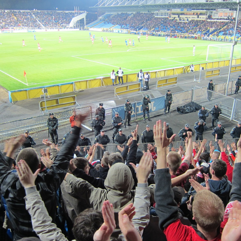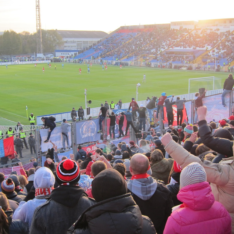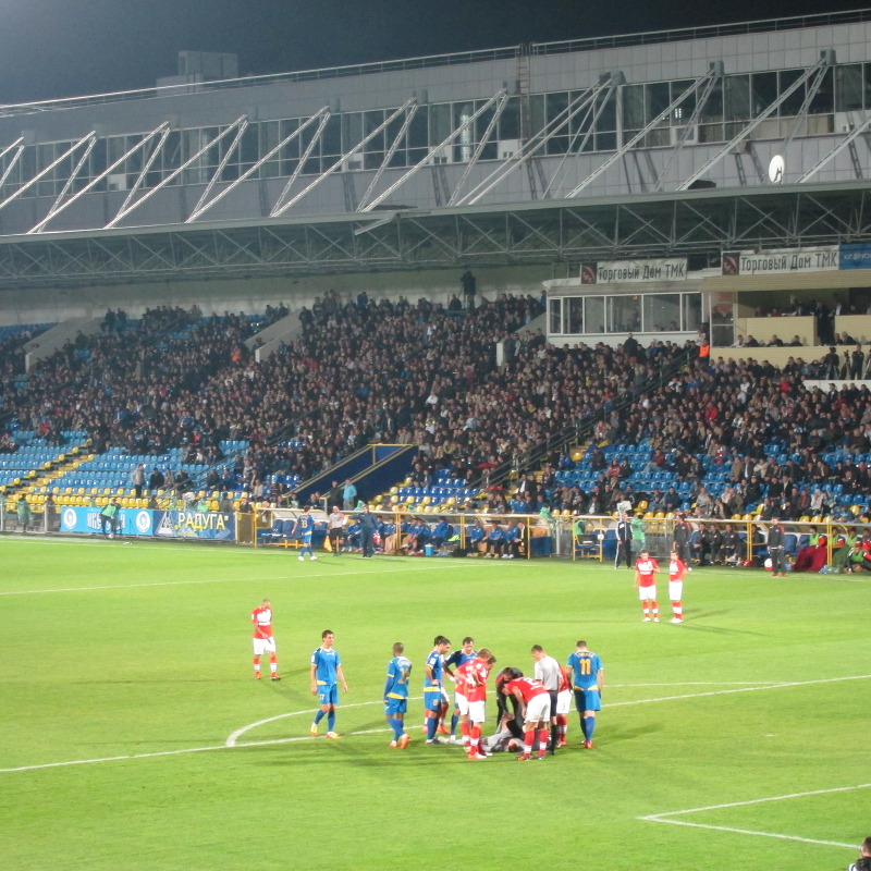 Вроде и выдвинулись с запасом, но сначала, в течение получаса не было ни одной маршрутки, а потом мы угодили в пробку. Полиция так организовала досмотр, что проход на стадион растянулся. К началу матча мы опоздали. Материли всё на свете. Войдя на трибуны мы присоединились… а в прочем особо не к чему было присоединяться – шизы не было. Болельщики подходили до конца первого тайма и в перерыве. Ко второму тайму ворота стадиона закрыли.