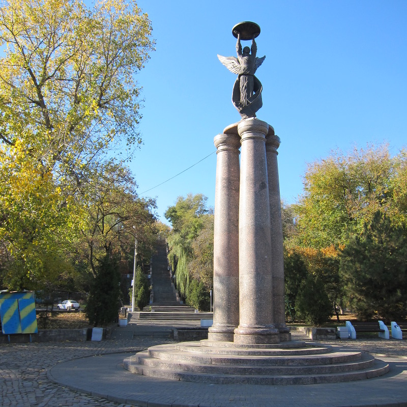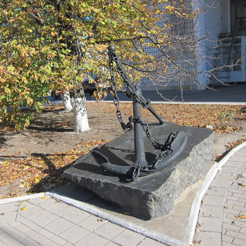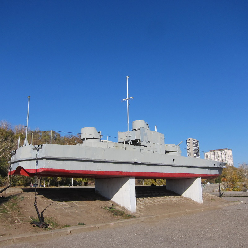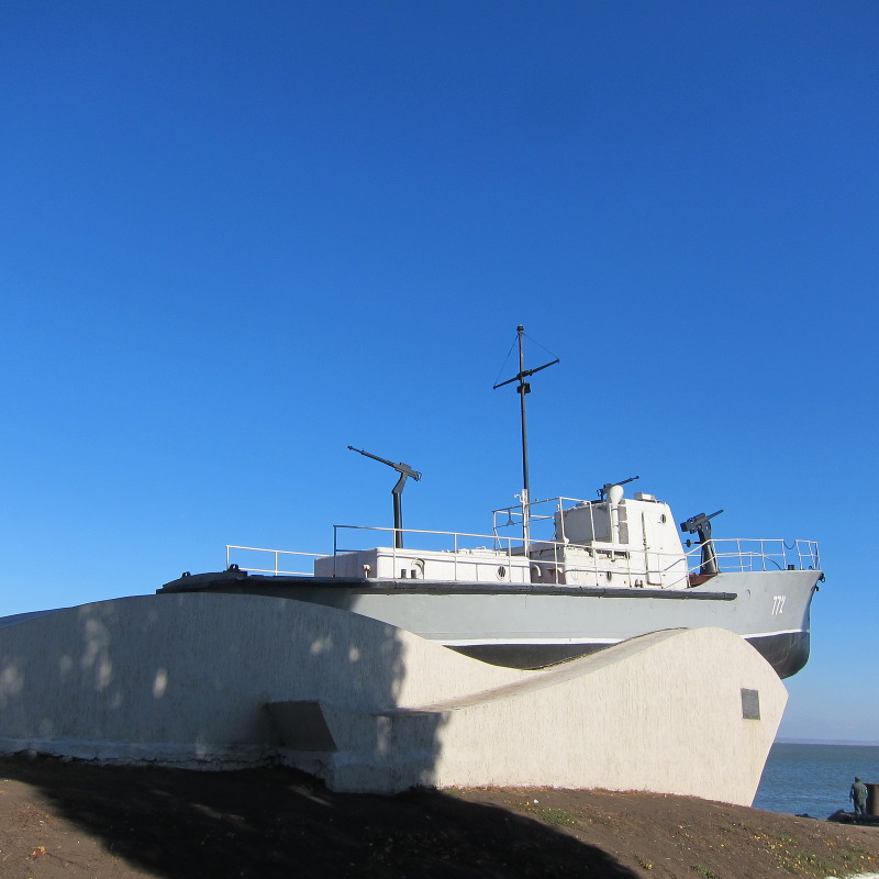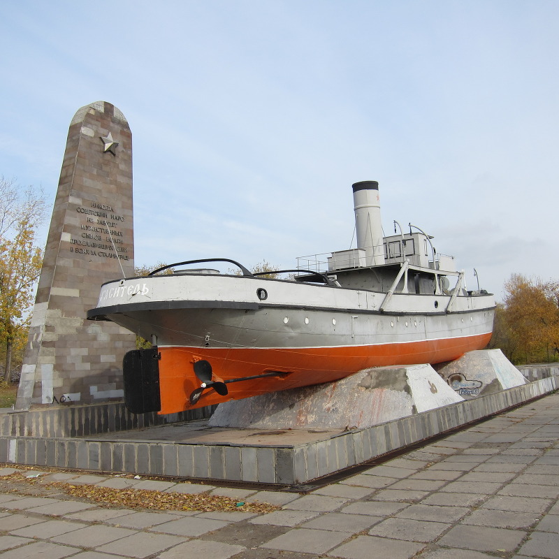 Памятник пожарному кораблю «Гаситель». Принимал участие в обороне города и был затоплен немцами в результате обстрела, но очень скоро его удалось поднять и отремонтировать.