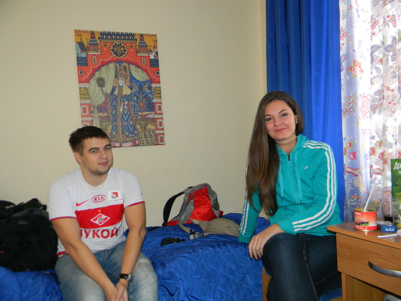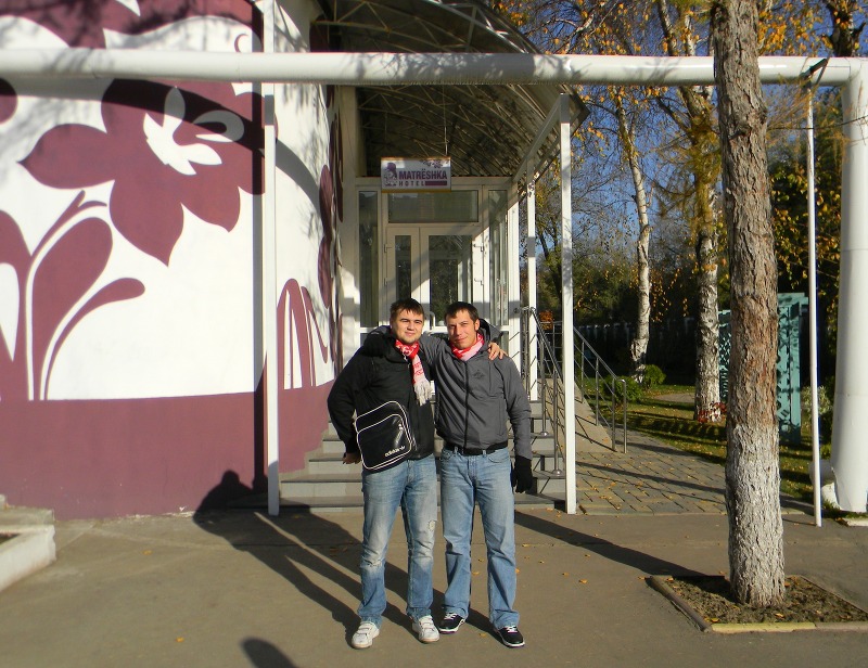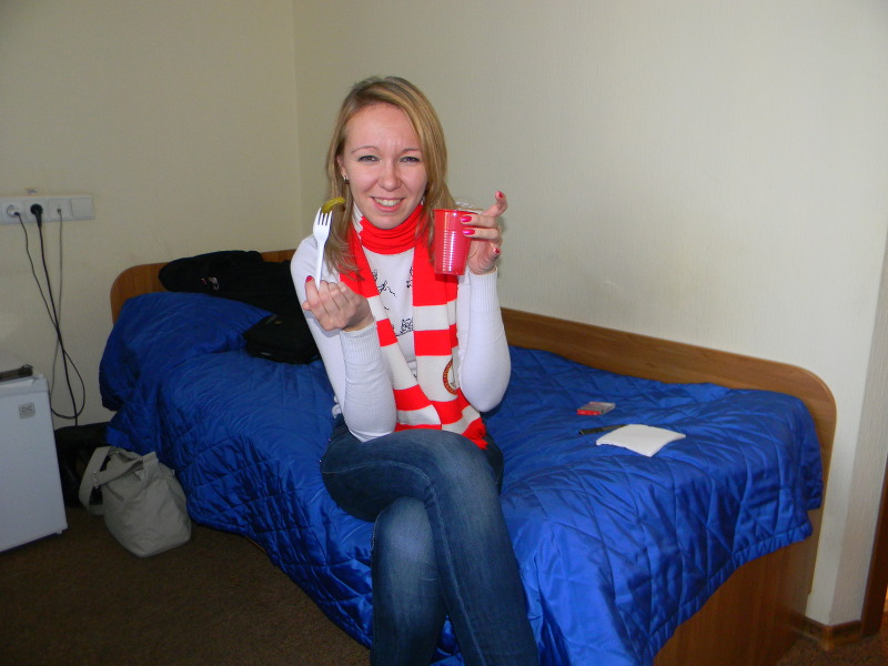 Когда я озаботилась тикетами на этот выезд, выяснилось, что на устраивающие меня поезда остались только плацкарты по 2300 и купе (о ужас!!!) по 4700 руб. Такие расклады меня не устраивали и я, взвесив все за и против, купила туда планер в день матча за 4100, а обратно плац на следующий день за 1400. Где буду ночевать не думала, по-любому кто-нибудь вписал бы. Но тут нарисовался Сектор и предложил переночевать в гостинице в номере с ванной). Через 2 дня мы окончательно определились, и наш ждал забронированный двухместный номер в гостишке с милым названием «Матрёшка».