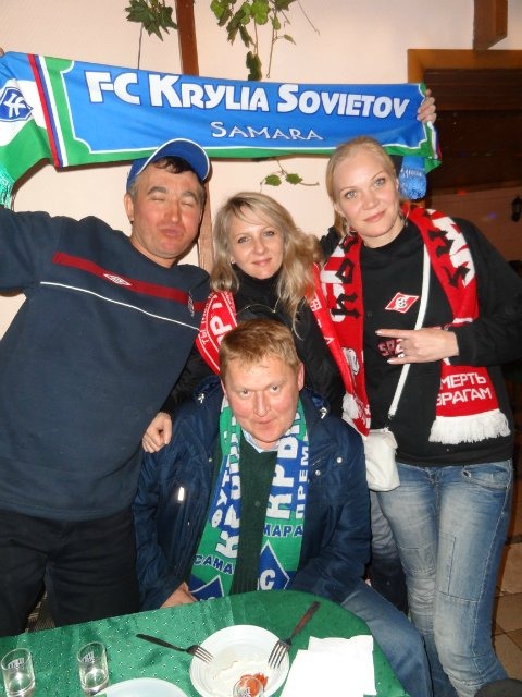 Мы поблагодарили команду и, веселые и дружные, отправились искать возможность уехать со стадиона. Так как метро далековато, остановки еще найти надо, а в «такси не содют», мы отправились в приглянувшееся заведение, чтоб отметить победу, а заодно и вызвать такси. В заведении нас встретили удивленные взгляды болельщиков Крылышек и вопрос: «А вы в первый раз в Самаре?». Это сразу натолкнуло меня на мысль, что дааа, удачно мы зашли… В итоге все закончилось очень доброжелательно - то попеременным, то совместным распеванием кричалок и вкусным застольем.
